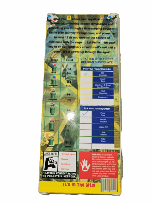 Perfect for deep introspective journeys, creative exploration, spiritual experiences, or consciousness expansion. The Penis Envy variety in milk chocolate offers a smooth, introspective experience, while the Tidal Wave in dark chocolate provides powerful waves of insight. Ideal for weekend adventures, meditation retreats, or personal growth sessions. Not recommended before work, driving, or during obligations. Best enjoyed in nature, comfortable indoor spaces, or during intentional ceremonial settings.