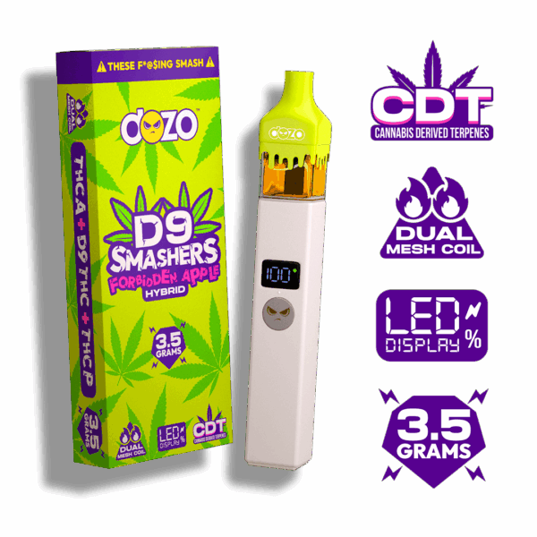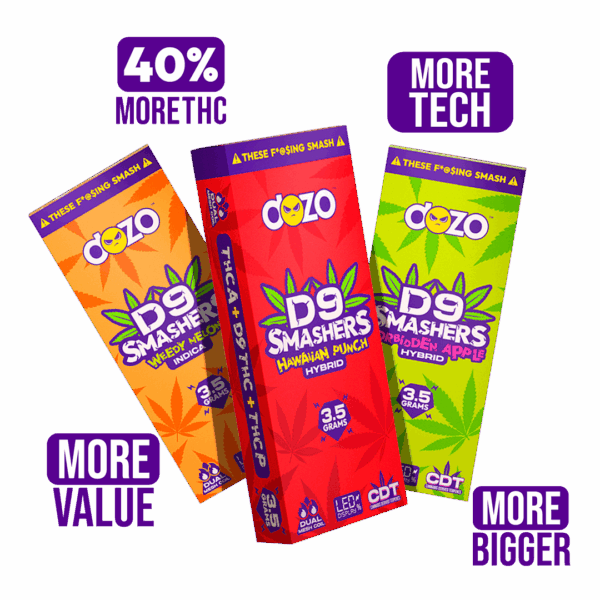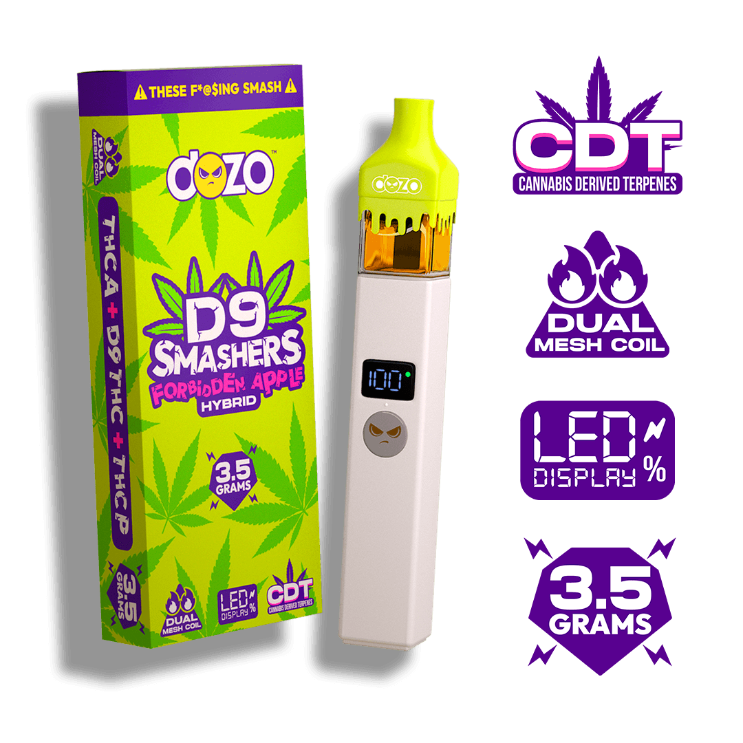 A: DOZO D9 Smashers are all-in-one disposable units with a substantial 3.5g capacity featuring a premium THCa blend combined with Delta 9 THC. Unlike standard cartridges that require a separate battery, these come ready to use straight out of the package. The THCa blend provides enhanced potency and a fuller spectrum of effects compared to distillate-only vapes.